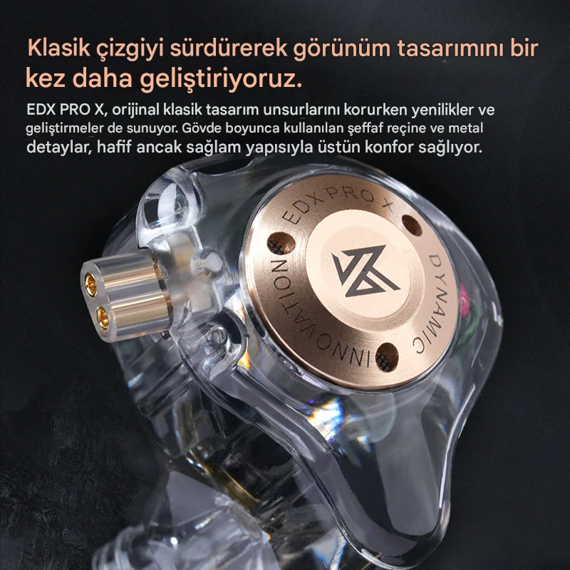 KZ EDX Pro X, orijinal klasik tasarım öğelerini korurken yenilik ve geliştirmeler de sunuyor. Gövde boyunca şeffaf reçine ve metal dekorasyonun birleşimi, hafif ancak sağlam yapısıyla en üst düzey konforu sağlar.