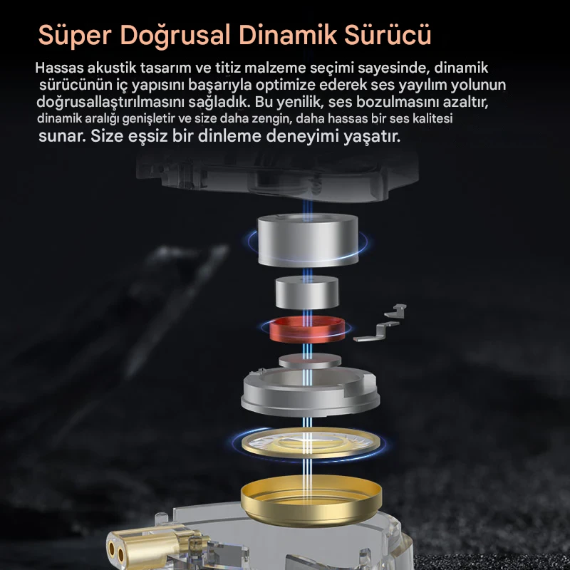 Hassas akustik tasarım ve titiz malzeme seçimi sayesinde, dinamik sürücünün iç yapısını başarıyla optimize ederek ses yayılım yolunun doğrusallaştırılmasını sağladık. Bu yenilik, ses bozulmasını azaltır, dinamik aralığı genişletir ve daha zengin, daha hassas bir ses kalitesi sunar. Size eşi benzeri görülmemiş bir dinleme deneyimi sunar.
